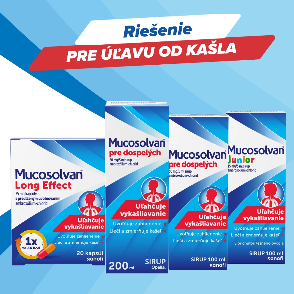 Mucosolvan® poskytuje účinnú úľavu pri prieduškovom kašli a dýchacích ťažkostiach sprevádzaných hustým hlienom. Účinná látka ambroxol uvoľňuje hlien, uľahčuje jeho vykašliavanie a zmierňuje kašeľ, a tak prináša rýchlejšie uzdravenie. Vďaka zloženiu bez obsahu lepku, alkoholu, cukru a laktózy je vhodný takmer pre každého. Mucosolvan®, ktorý si získal dôveru odborníkov a je podporený viac ako 100 klinickými štúdiami, je osvedčeným riešením pre úľavu od kašľa pre celú rodinu.